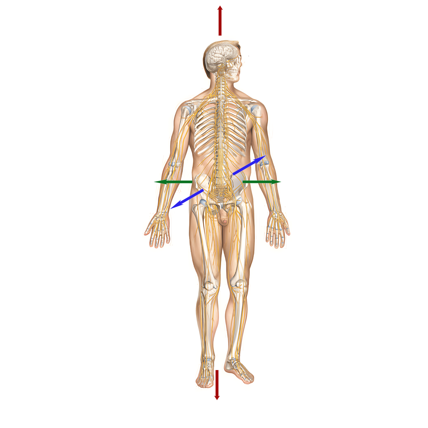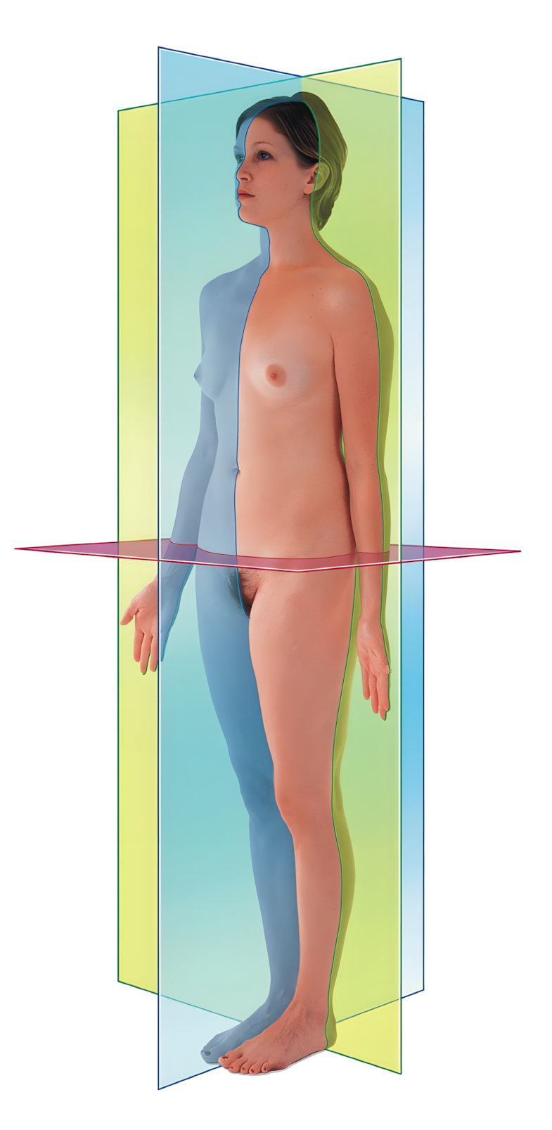 - Фронтальды жазықтық (planum frontale) сары түспен белгіленген - Денені алдыңғы және артқы бөліктерге бөледі.