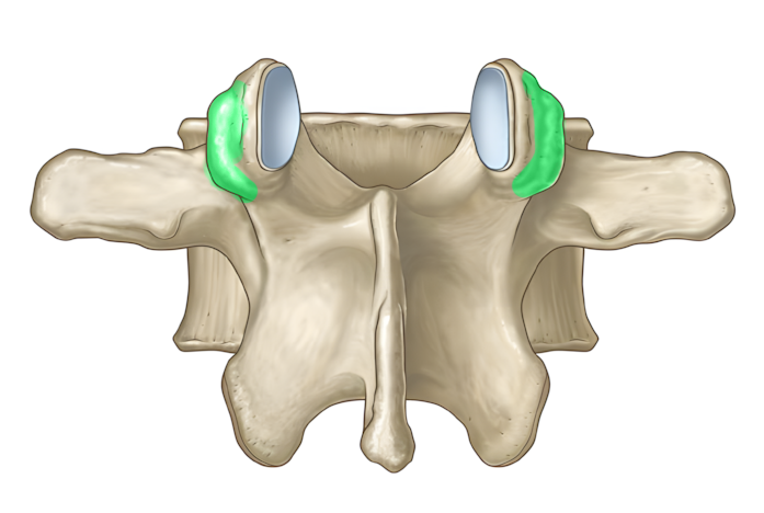 жоғарға буын өсіндісі (processus articularis superior) онда жоғарға буын беті (facies articularis superior) олар ішке қарап орналасады